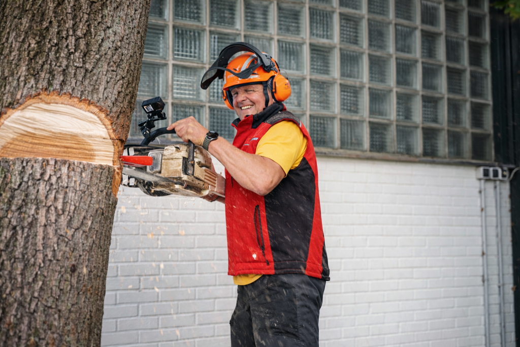 Eddy Bialdyga bei der Arbeit, sogar auf der Kettensäge ist eine Kamera für die Produktion angebracht. Foto: DAMX/Fandango Film & TV