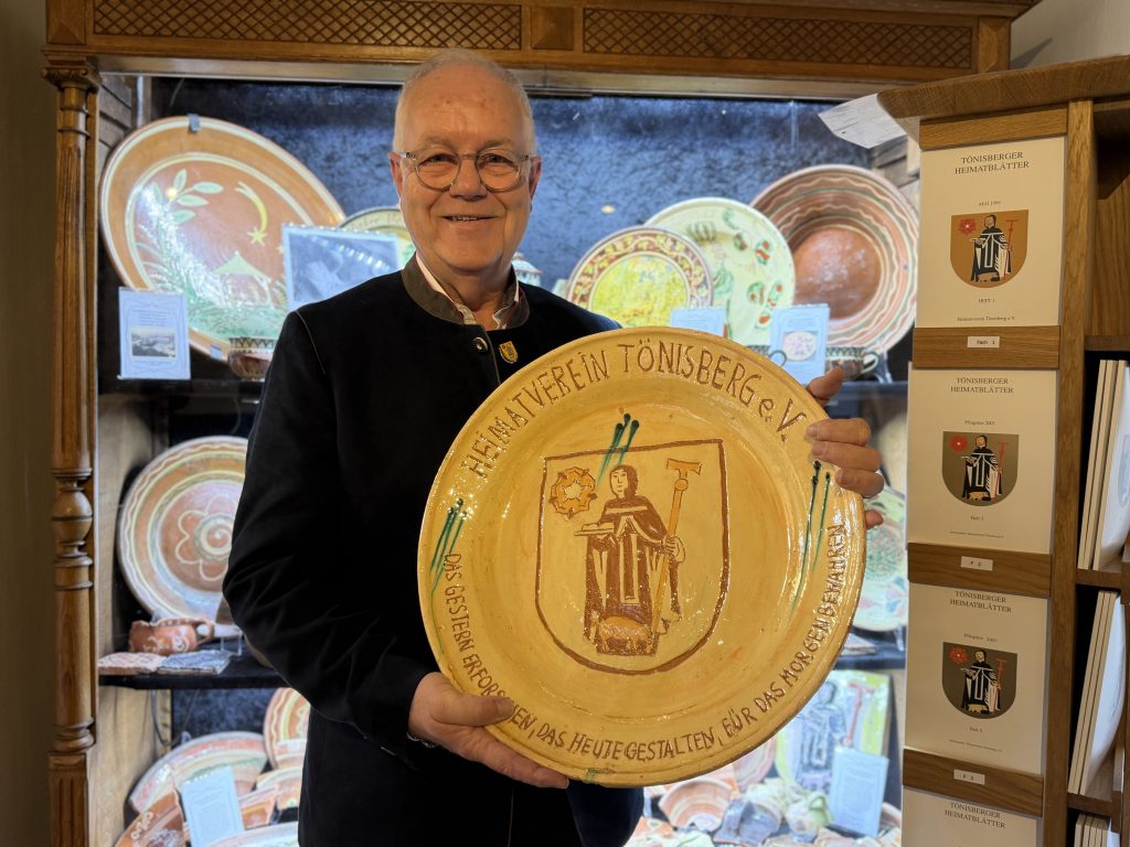 BU: Der Vorsitzende des Heimatverein Tönisberg e.V. Helmut Thissen mit dem Heimatvereins-Pottbäckerteller.